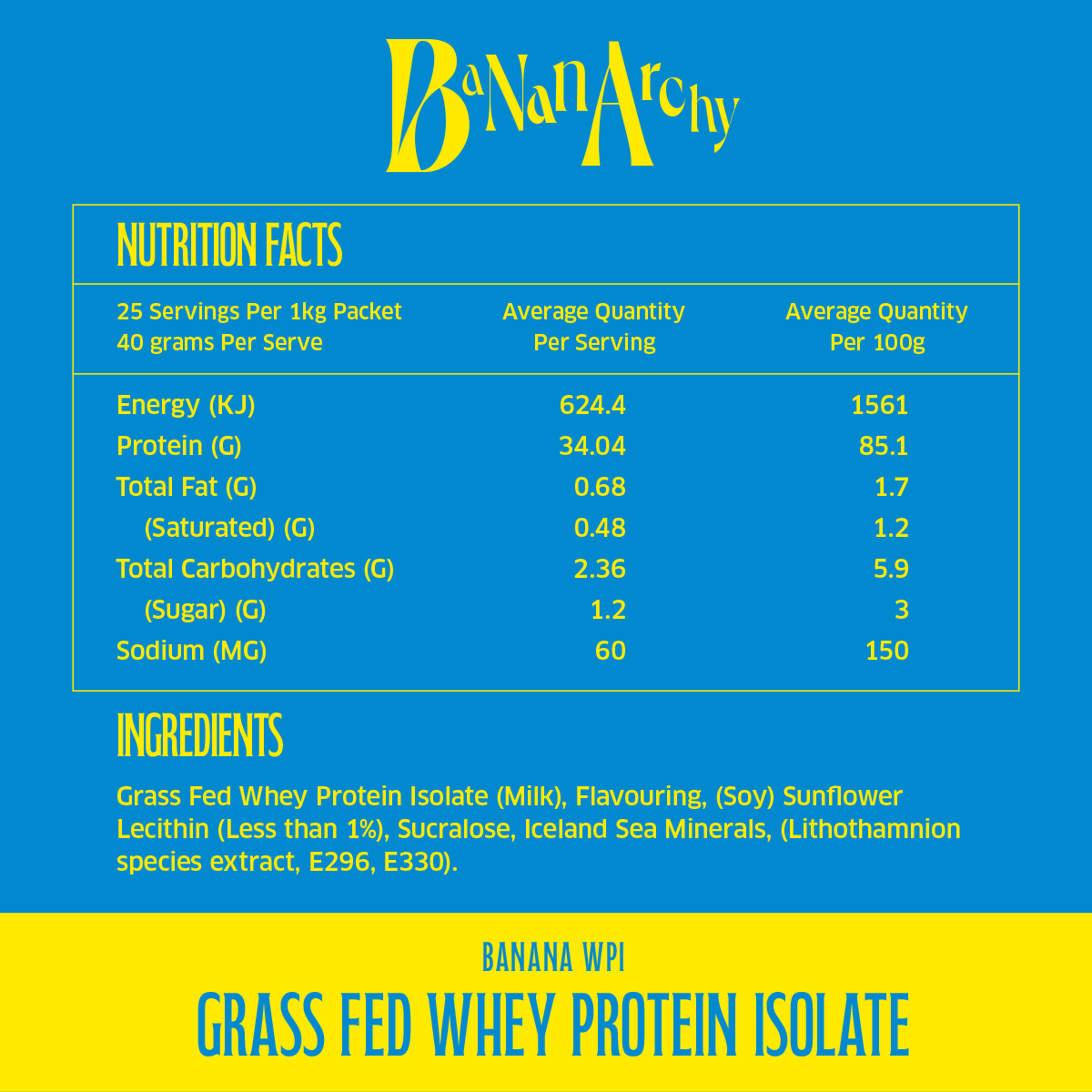 Bananarchy is built on grass fed WPI (Whey Protein Isolate). It’s high protein, very low fats and carbs, fast to absorb, easier on most people than standard whey. It’s for people who don’t always have time for breakfast but still expect their body to show up.
